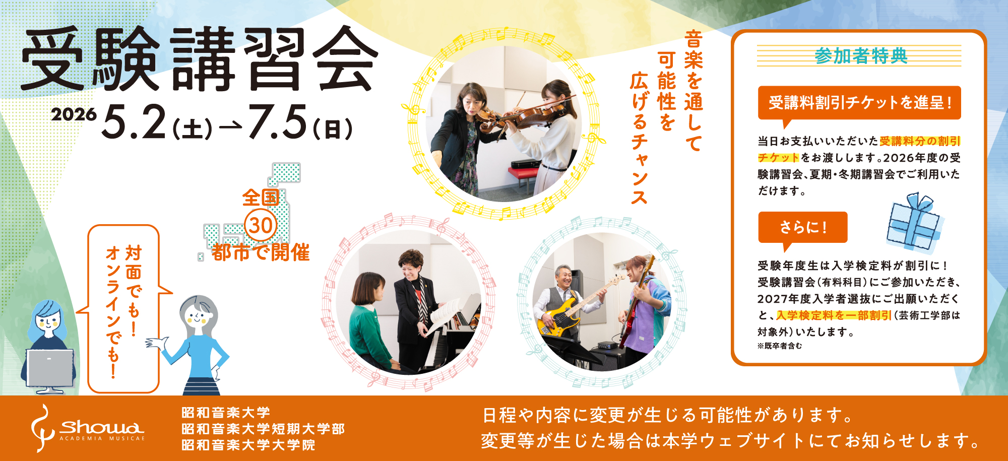 受験講習会(有料科目)にご参加いただき、2027年度入学者選抜にご出願いただくと、入学検定料を一部割引(芸術工学部は対象外)いたします。※既卒者含む